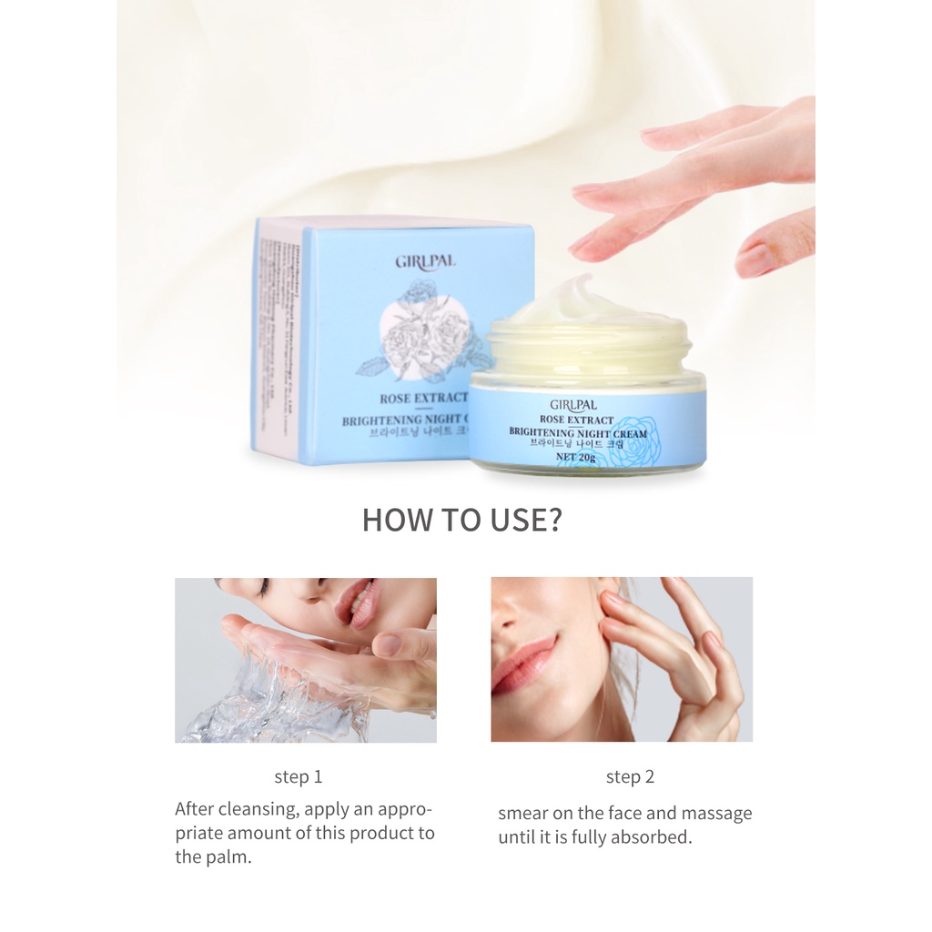 Langkah-langkah penggunaan: ①. Bersihkan wajah di malam hari sebelum tidur. ②. Ambil GIRLPAL Brightening Night Cream secukupnya. ③. Aplikasikan dengan cara memijat halus kulit hingga produk meresap sempurna.