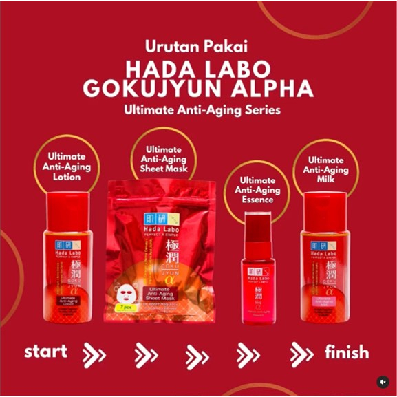 1. Hada labo Gokujyun Alpha Ultimate Anti Aging Lotion 100ML - Pre moisturizing, 1 langkah sebelum pelembab. - Mengandung 3 keunggulan Anti Aging : Retinol Derrivate (Vitamin A), Collagen dan Improved Hyaluronic Acid.