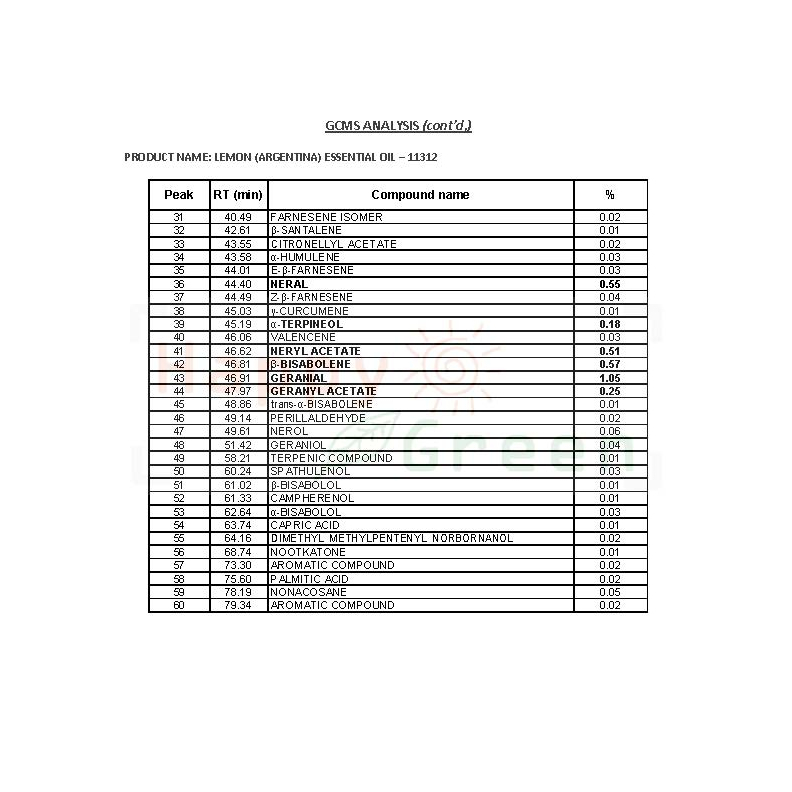 Nama Scientific : Citrus limonum Asal minyak : Kulit Lemon Ekstraksi : Cold Press Aroma : Segar, wangi jeruk, terang Kekuatan aroma: Sangat Tinggi Evaporasi : Top Note