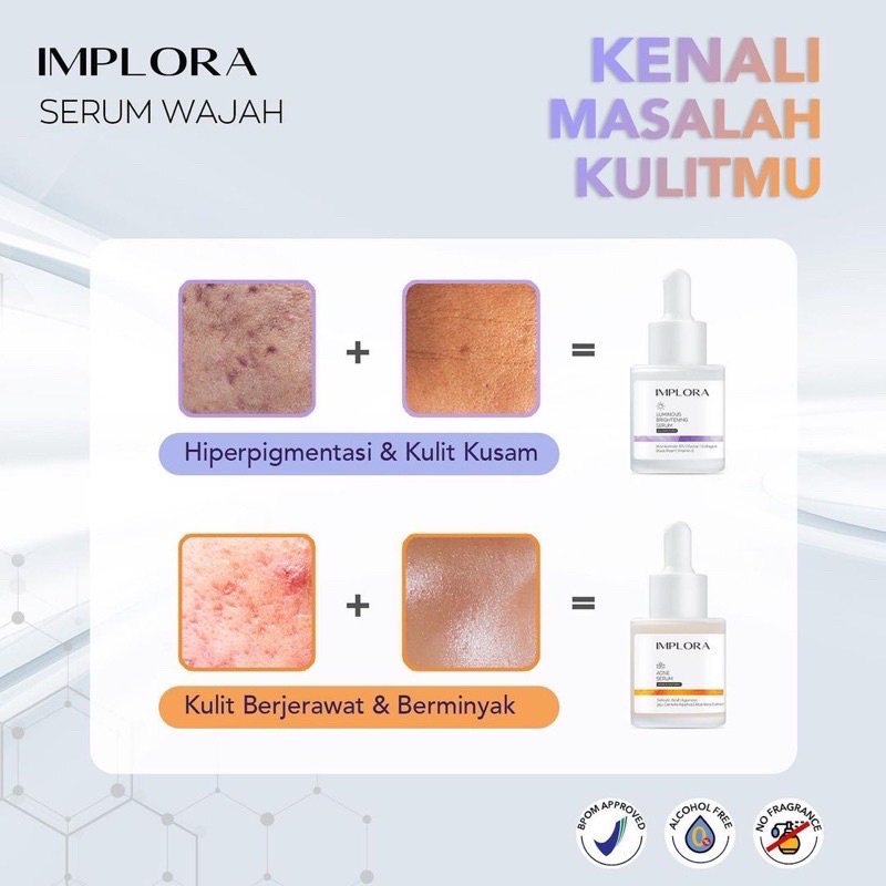 *LUMINOUS BRIGHTENING SERUM Implora Luminous Brightening Serum mengandung Niacinamide 10% dan Kakadu Plum yang kandungan vitamin C nya 70 kali lebih banyak dari buah jeruk, yang dapat membantu mencerahkan, melembabkan, menyamarkan noda hitam serta menutrisi kulit. Dapatkan tampilan kulit yang sehat dan bersinar dengan menggunakan secara rutin. - Direkomendasikan untuk semua jenis kulit - Penggunaan pagi dan malam hari - Mengandung : Niacinamide 10%, Caviar Collagen, Black pearl, Vitamin C