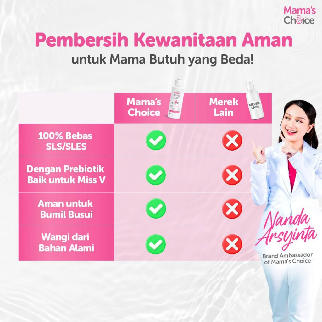 Jaminan Aman Pembersih Kewanitaan Mama's Choice: - Formula khusus, aman untuk kulit sensitif, Bumil & Busui - Hypoallergenic Tested - Dermatologically Tested - Natural Active Ingredients - Sulfates (SLS/SLES) free - Perfume free