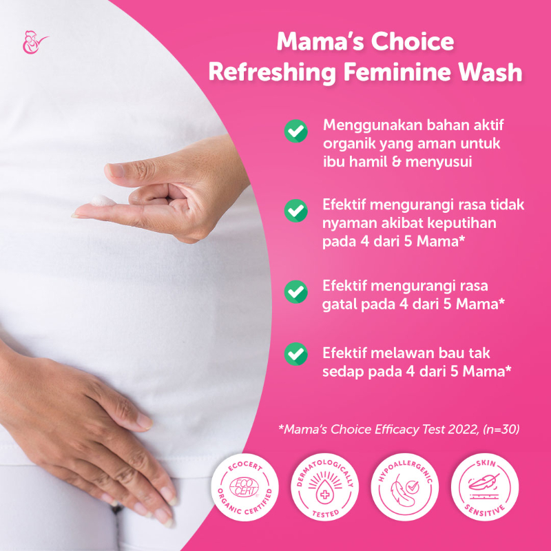 Mengapa Refreshing Feminine Wash Mama’s Choice? - Dengan bahan aktif natural, aman untuk Bumil & Busui - Tanpa SLS/SLES, tidak membuat miss V kering - Efektif mengurangi rasa gatal pada 90% Mama* - Efektif melawan bau tak sedap pada 80% Mama* - Efektif mengurangi keputihan pada 60% Mama*