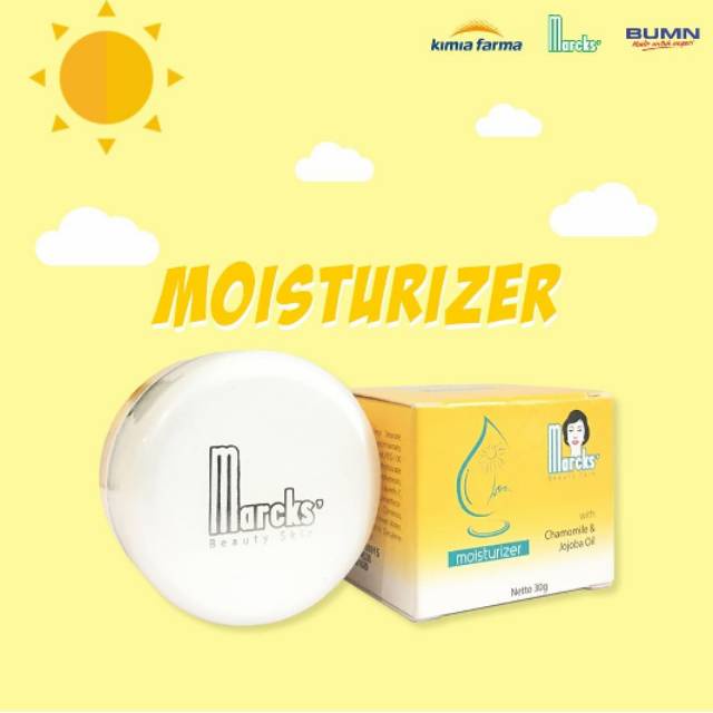 Moisturizer 30gr merupakan pelembab persembahan Marcks' yang membantu melindungi kulit dari paparan sinar matahari. Pelembab ini mengandung jojoba Oil & Extract Chamomile yang berfungsi menjaga kelembaban dan melindungi kulit dari iritasi ringan. Oleskan tipis merata pada wajah dan leher sesudah dibersihkan. Untuk hasil maksimal, gunakan setiap hari dengan rangkaian produk Marcks’ lainnya.