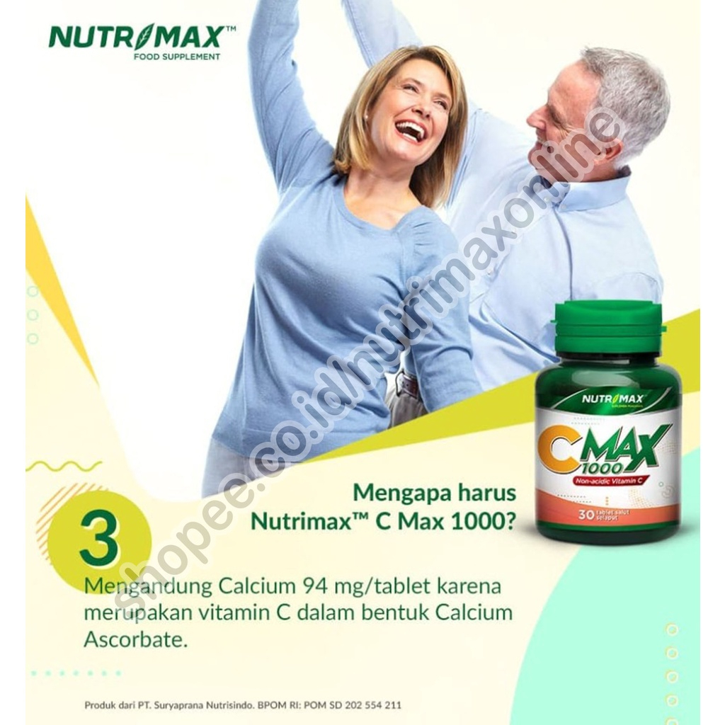 Nutrimax C Max 1000, Vitamin dan Nutrisi Alami yang sangat ampuh dan aman untuk meningkatkan daya tahan tubuh. berbeda dengan vitamin C biasa (Asam Askorbat) karena Vitamin C dibuat dalam bentuk Calcium Ascorbate (Non Acidic Vitamin C) yang bebas asam sehingga tidak menyebabkan mual, sakit perut, diare, dan aman bagi penderita maag, juga tidak mudah rusak akibat asam lambung sehingga penyerapannya maksimal dan bertahan lebih lama di dalam tubuh, Mengandung Calcium 94 mg/tablet karena merupakan vitamin C dalam bentuk Calcium Ascorbate. Bentuk Calcium Ascorbate yang tidak bersifat asam dan diserap lebih baik dibanding Ascorbic Acid (vitamin C biasa) membuat potensi penumpukan oksalatnya lebih rendah sehingga aman bagi ginjal dan tidak menyebabkan pembentukan batu ginjal.