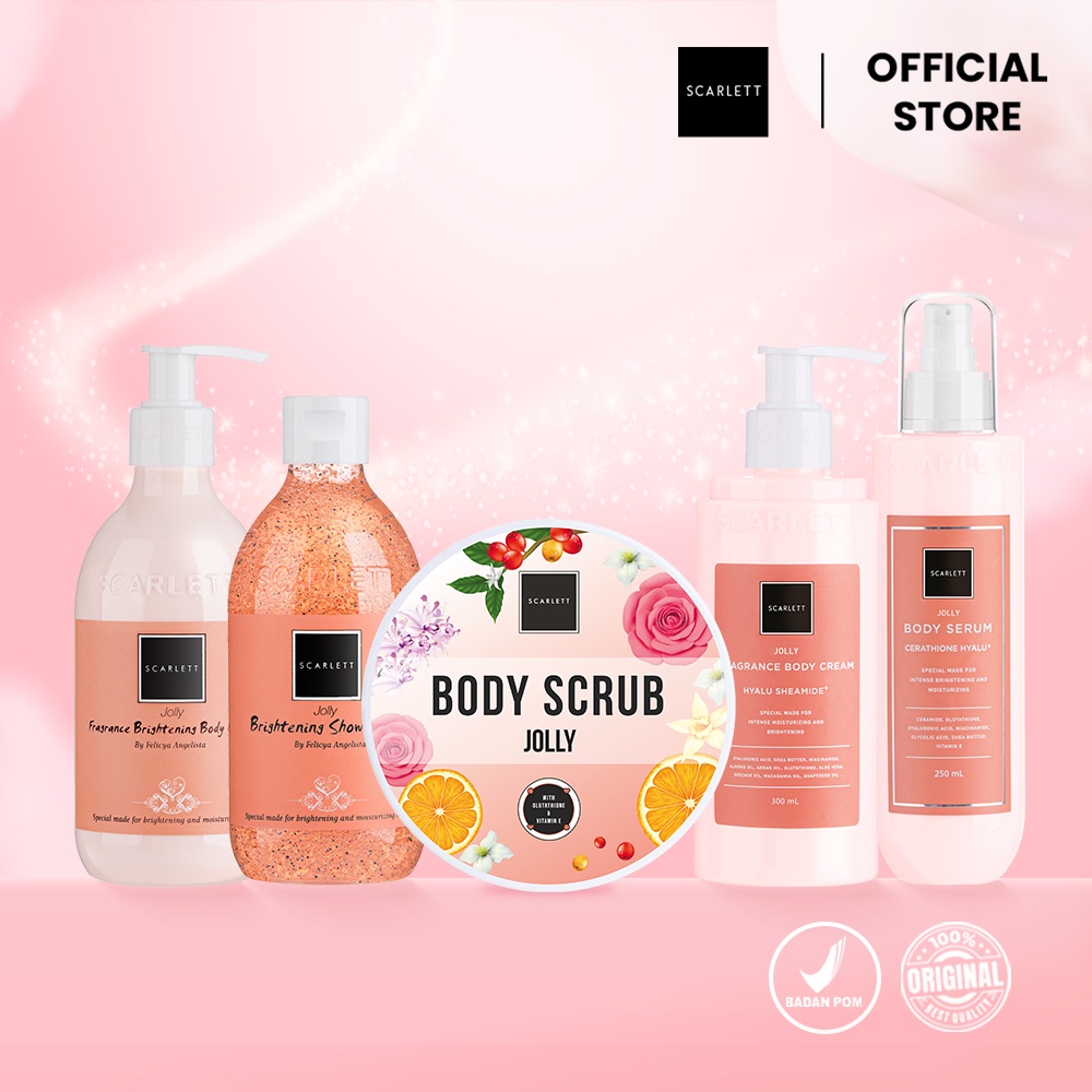 4) Scarlett Whitening Body Cream Jolly 300 ML 4x Lebih Melembapkan dengan Bantuan dari Hyaluronic Acid + 5 Phyto Oil + Shea Butter + Aloe Vera Extract yang bermanfaat untuk : • Memberikan kelembapan ekstra pada area kulit yang kering dan menghaluskan area kasar seperti siku, lutut, kaki, dan tangan • Merawat elastisitas kulit