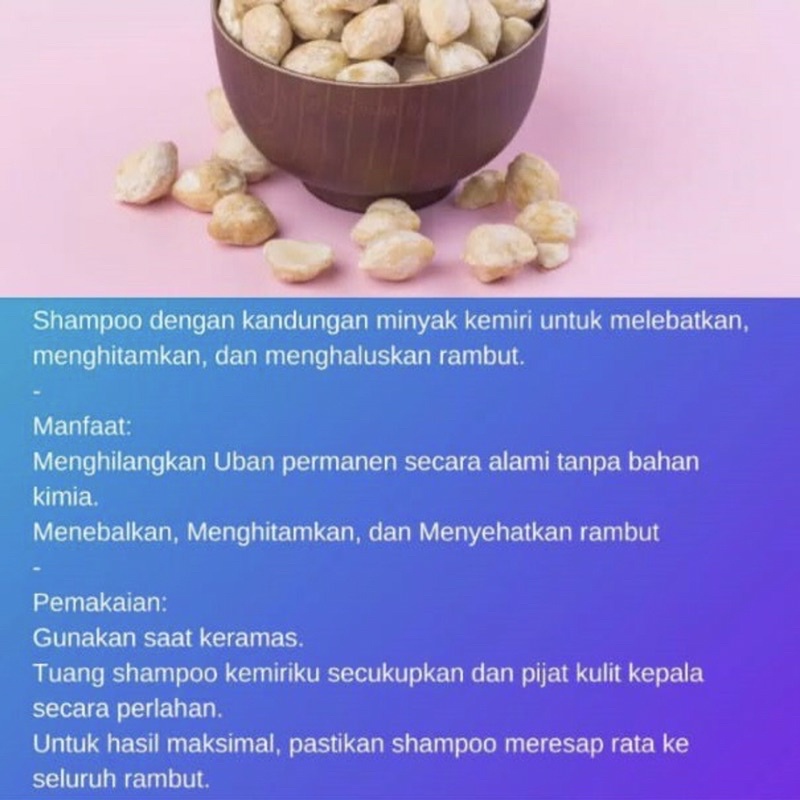 - Shampoo dengan kandungan minyak kemiri asli untuk melebatkan, menghitamkan, dan menghaluskan rambut.