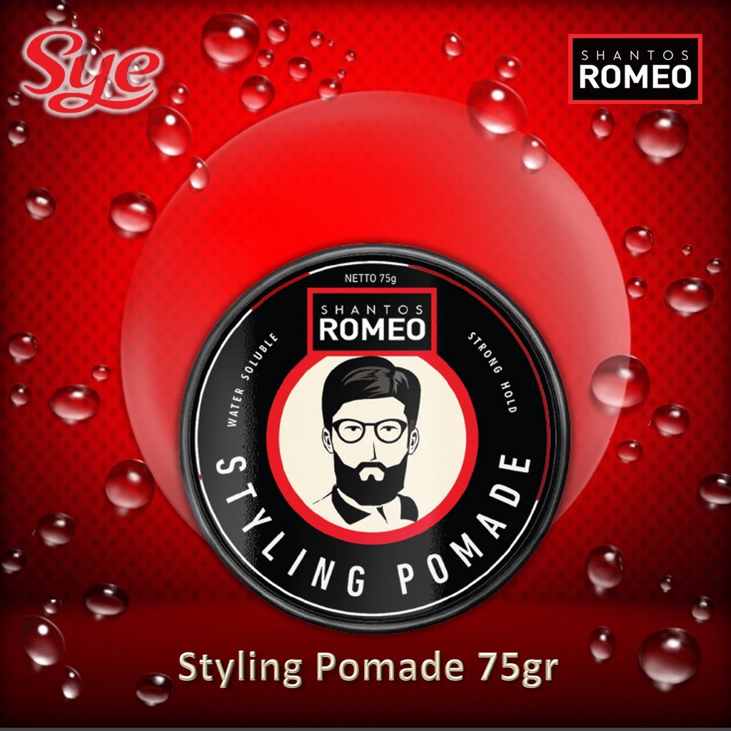 Shantos Romeo Styling Pomade 75gr ( Water based ) • Water Based (mudah dibilas dengan air) • Strong Hold (rambut kaku) • Aroma Vanilla • Tidak Berminyak • + Moisturizing agent (menutrisi rambut tetap sehat)