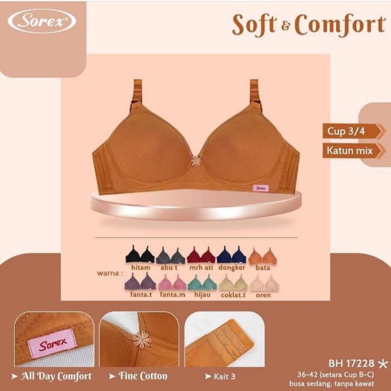 Bra Sorex Tanpa Kawat 17228 bra tanpa kawat sorex yang nyaman dipakai sehari-hari - Cup sedang B - Paling laris di pasaran - nyaman di pakai dan lembut - Busa sedang tanpa kawat, kait 3 nyaman - size : 36/80 38/85 40/90 42/95