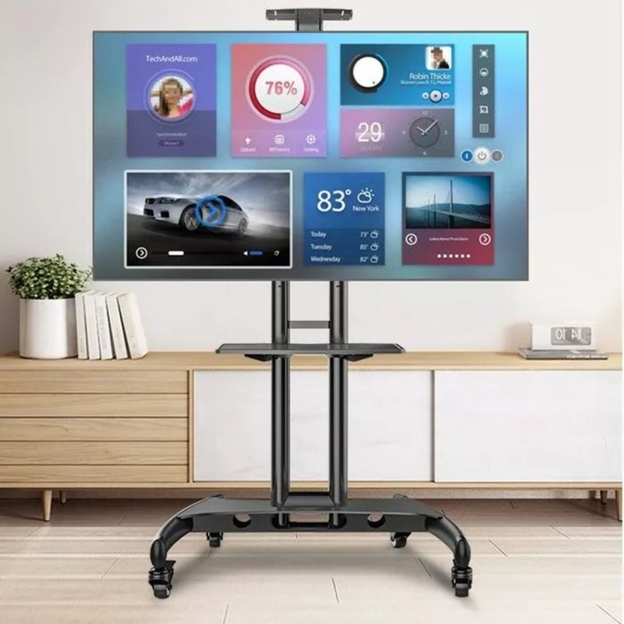 Fitur: • TV panel datar dari 32-75 "diagonal dan hingga 100 lbs. • Sesuai dengan VESA dari 100mm x 100mm hingga 600mm x 400mm. • Ketinggian layar dapat disesuaikan dari 1030mm hingga 1530mm.. • Tinggi Rak yang dapat disesuaikan untuk peralatan AV (batas 10 lbs) 4.5kg. • Tinggi Rak untuk video tray yang dapat disesuaikan di atas layar Anda untuk telekonferensi. • Manajemen Kabel Terintegrasi untuk menyembunyikan kabel Anda. • Empat kastor putar tugas berat, dua mengunci. • Braket gembok pengaman yang akan digunakan dengan gembok Anda untuk mencegah pencurian. • Konstruksi seamless dengan black powder coating finishing. • Mudah dirakit atau dibongkar; panduan instalasi produk yang lengkap disertakan dalam paket pembelian.