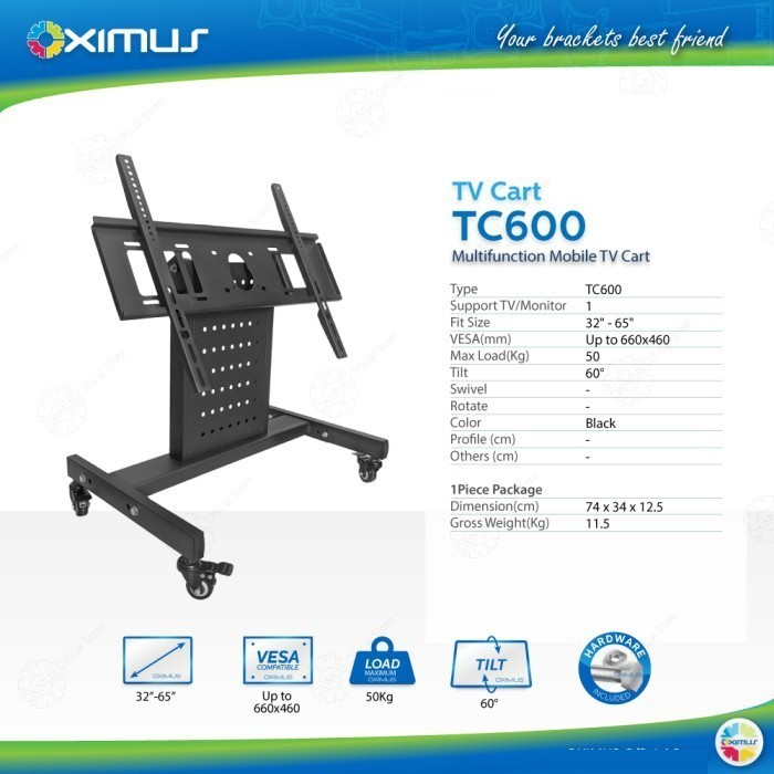 Brand : Oximus Model : TC600 Support Monitor/TV : 1 Fit Size : 32" - 65" VESA Support (mm) : Up to 640x440 Tilt : +60° Swivel : NO Rotate : NO Max Load (Kg) : 50 Max Height (cm) : - Color : Black Mounting Hardware Included : Yes 1pcs Package Dimension(cm) : 74 x 34 x 12.5 Gross Weight (Kg) : 11.5 *Note: Larger screen panels can be used with this bracket as long as the VESA bore is suitable and the weight do