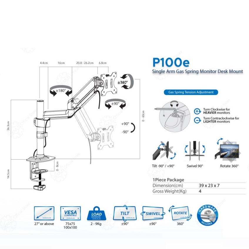 SPECIFICATION Brand : OXIMUS Type : P100e Support : 1 Monitor/TV VESA Support (mm) : 75x75 - 100x100 Fit Size : 27" - 34" or Above ( Depend on Weight ) Min - Max Load (Kg) : 2kg - 9kg /arm ( 11 kg/arm tested OK ) Tilt : -90° / +90° Swivel : 90° Rotate : 360° Max Pole Height (cm) : 36 ( detail on 2nd picture ) Max Desk-Clamp Clearance (cm) : 8 Color : Black / white Mounting Hardware Included : Yes