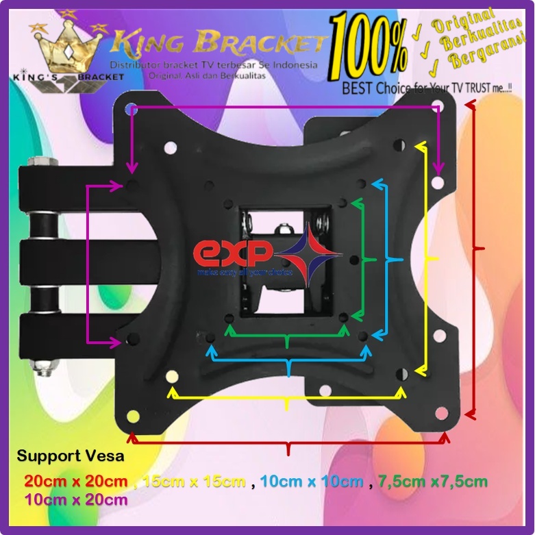 * Bisa di gerakan ke 6 arah (Nengok Kanan-Kiri, Maju-Mundur, Nunduk-Dangak) * Cocok untuk TV 14" s/d 43" (semua merk TV sesuai vesa, arti vesa ada dicatatan deskripsi paling bawah) * Support Vesa (Varian Lokal): - 7.5cm x 7.5cm - 10cm x 10cm - 10cm x 20cm - 20cm x 20cm <== MAXIMAL (Berapapun hasilnya jarak lubang baut dudukan bracket pada TV anda, selama tidak lebih dari Vesa MAXIMAL 100% PASTI COCOK) * Support Vesa (Varian IMPORT): Vertikal x Horizontal 7.5cm x 7.5cm - 10cm x 10cm - 15cm x 15cm - 10cm x 20cm - 20cm x 20cm
