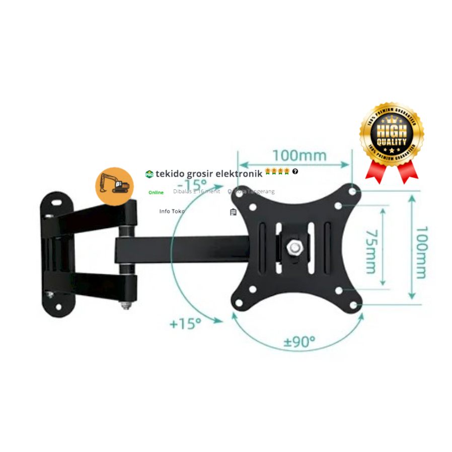 Ukuran televisi : 14"-27" Bahan : Baja Gulungan Dingin Tingkat kemiringan : 15 ~ +15 Derajat Memutar : 180 Drgrees Kapasitas pemuatan : (10kg) Warna : Hitam Jarak ke dinding : 50-410mm VESA maks : 100x100mm