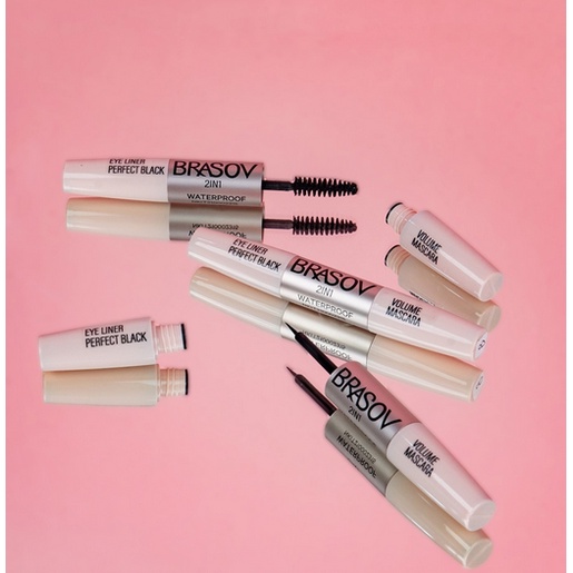 brasov 2 in 1 volume mascara & eye liner perfect black waterproof 5grm &5ml. melentik, memanjangkan, bulu mata serta waterproof. menjadikan mata tampak lebih indah dah mempersona.