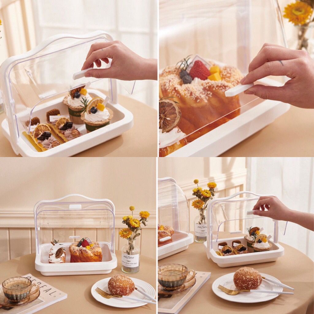 Wadah Saji Nampan Roti Baki dengan Tutup Transparan Penutup Makanan Serbaguna Tempat Multifungsi Model Estetik dan lucu sehingga mempercantik ruangan. Produk ini dilengkapi dengan penutup transparan yang bisa dibuka tutup di kedua sisi dan Handle di sisi atas sehingga mudah diangkat.