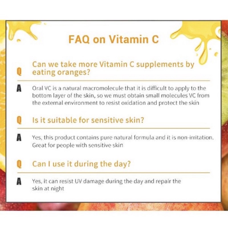 ⭕PENCEGAHAN 1.Jika kulit sensitif, silakan uji produk di bagian dalam lengan terlebih dahulu. Lanjutkan untuk menggunakannya seperti biasa jika tidak ada ketidaknyamanan. 2.Jika timbul ketidaknyamanan, harap segera berhenti menggunakan produk dan minta bantuan dokter kulit. 3.Jika produk tercebur ke mata Anda, segera basuh dengan air tawar ---------------------------------------------------------------------------------------------------------------------------------- [EFFECTS] Containing high activity small-molecule Vitamin C, with antioxidant protection, this product can prevent melanin formation. Also with such functions as whitening and brightening the skin color, and removing blemishes and melanin, it can restore skin health, promote skin metabolism and activate damaged skin cells so as to restore elasticity.