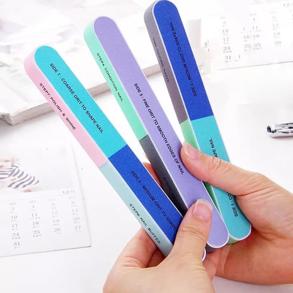 Tekstur dan langkah-langkah : Step 1 : Grit kasar untuk membentuk kuku Step 2 : Grit sedang untuk menghaluskan bentuk Step 3 : Grit halus untuk menghaluskan tepi kuku Step 4 : Kondisi kuku Step 5 : Kuku halus Step 6 : Buffer kuku Step 7 : Poles dan bersinar