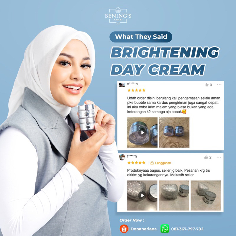 Brightening Day Cream : Cream siang yang mampu mencerahkan dan melindungi kulit wajah dari paparan buruk sinar matahari. (Mengandung Alpha-Arbutin) BPOM NA18200108528
