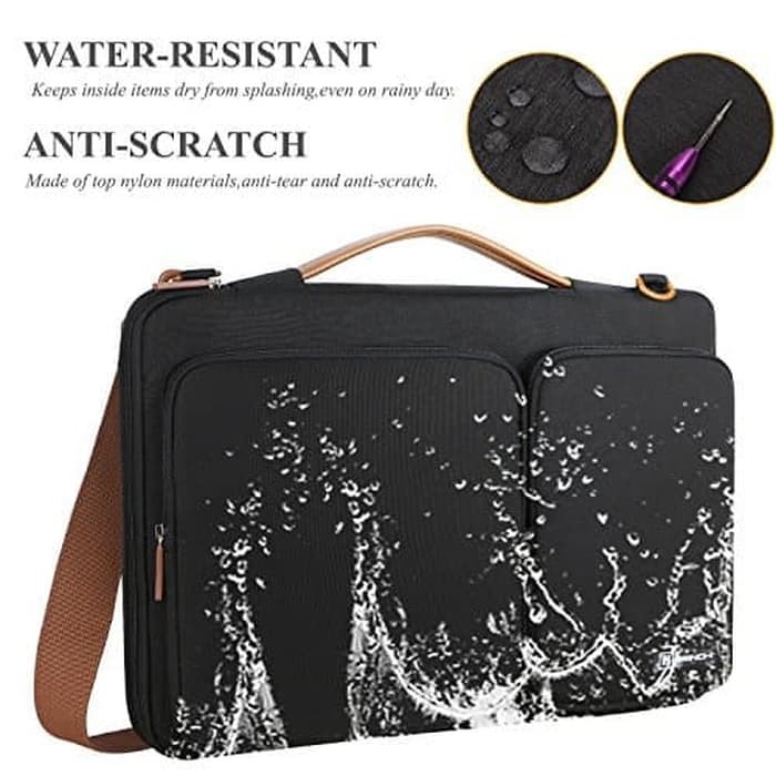 DESAIN PORTABEL Anda dapat membawa tas laptop ini dalam beberapa gaya : (1) Di tangan / dijinjing dengan pegangan kulit lembut yang kokoh; (2) Di bahu /crossbody menggunakan tali bahu yang dapat dilepas atau dipasang sesusi dengan keingian Anda; (3) Tas Laptop ini juga dapat ditaruh diatas troli koperkesayangan Anda dengan tali bagasi yang terdapat pada bagian belakang tas. 360 Full Extra Protection Melindungi seluruh bagian dan sisi kompartemen laptop dengan alas lembut tebal & lapisan berbulu pada bagian dalam tas untuk melindungi laptop lebih baik di setiap sisi, menyerap dampak dan mengurangi kerusakan yang disebabkan oleh benturan & goresan yang tidak disengaja. SLIM & LIGHTWEIGHT Tas ini memiliki berbagai kantong untuk menyimpan aksesories kebutuhan sehari-hari, seperti telepon, pena, mouse, charger dompet, adaptor, kabel dll, dan sangat mudah untuk dimasukkan ke dalam ransel atau koper saat bepergian, karena bentuknya yang compat dan ringan . RESISTNAT AIR Terbuat dari High Quality Nylon anti air ,sehinnga melindungi Laptop Anda dari percikan air. UKURAN Eksterior:40 x29 x 5CM cocok untuk sebagian besar Laptop 14 inch Laptop / Notebook / / / Chromebook / Tablet PC Computers ( Apple Macbook / Acer / Asus / Dell / Fujitsu / Lenovo / HP / Samsung / Sony / Toshiba etc.)