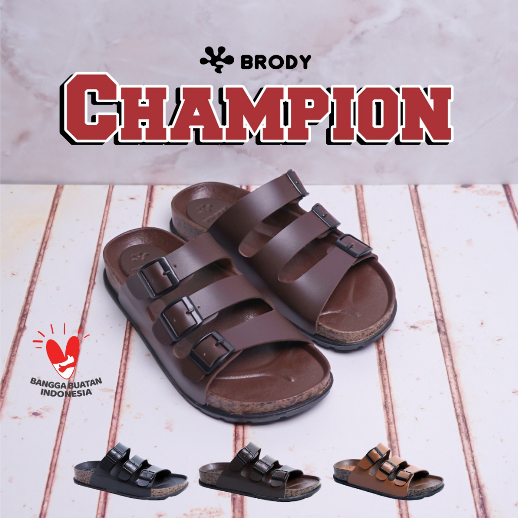 Brody Champion adalah Sandal Selop Model Birken atau motif sol telur puyuh terbaru. Dengan Upper 3 ban dengan 3 gesper yang bisa disetel akan membuat sandal ini terlihat mewah, walaupun harganya ramah. Untuk kualitas jangan diragukan lagi, terbukti dengan model sebelumnya, Brody Bravo, Sara Sara Jinny, banyak konsumen yang sudah memuji kualitas dan modelnya.