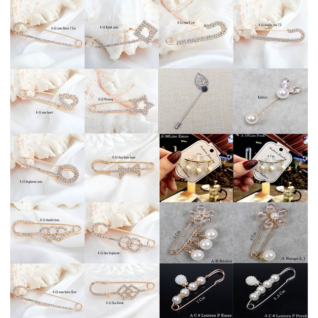 Category: Brooch Style: ethnic style Material: Pearl Style: Korean untuk peniti karakter, seperti one heart dua kotak kotak satu lingkaran satu dua lingkaran dll yang belum ada keterangan di poto panjang peniti nya 6 Cm