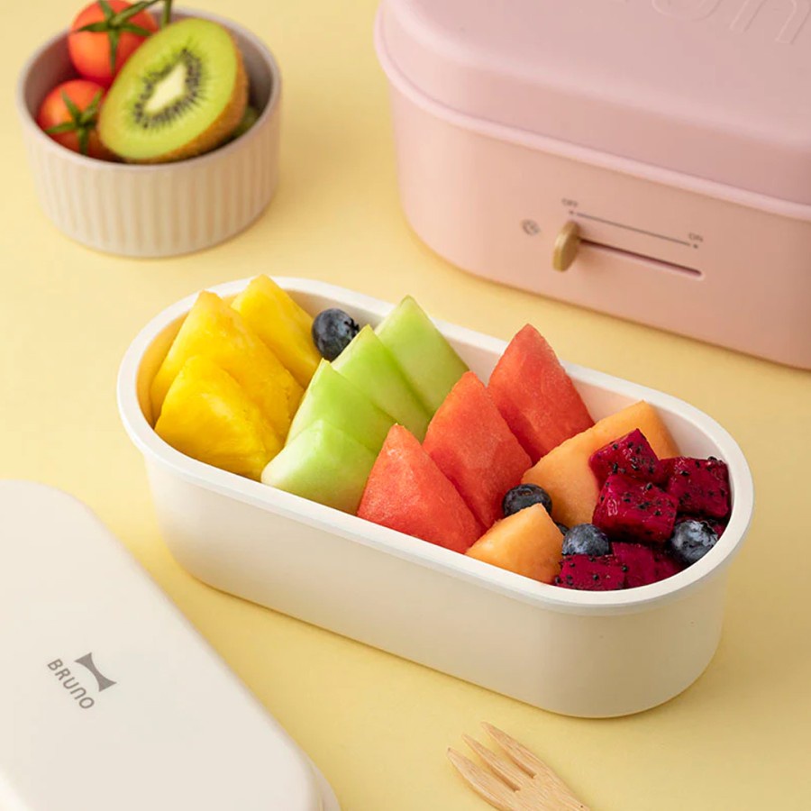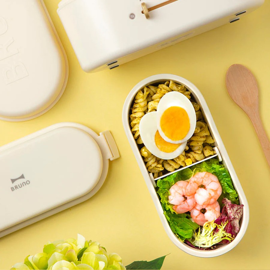 Bruno Lunchbox Warmer Portable dapat menjaga makanan tetap segar saat pergi bekerja. Luncbox ini 650ml cukup untuk satu orang, dan dilengkapi penutup dengan bahan pendingin. dapat di dinginkan selama 6 jam sebelum digunakan, dan makanan di dalam kotak dapat disimpan dalam suhu dingan selama 3 jam; selama dicokkan, tidak perlu menambahkan air. waktu memanaskan 30 menit mencapai suhu 75°C (40 menit untuk kotak makan siang berpendingin).