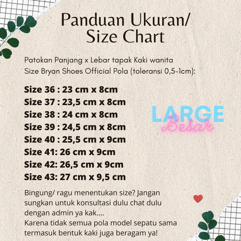 *Bagi yang kakinya kurus tipis disarankan turun size, dan jika gemuk naik size. Kenalilah tipe kakimu ya ladies! Jika ragu silahkan konsultasikan dengan admin via chat ya. Wajib dibaca: Size 36 jika kakinya kurus tidak disarankan order ya kak, kalaupun mau silahkan checkout dengan produk shoespad/ busa depan (ada di etalase terpisah) untuk menambah volume kaki. Kami tidak menerima return tanpa adanya konsultasi size terlebih dahulu melalui chat dengan alasan apapun!
