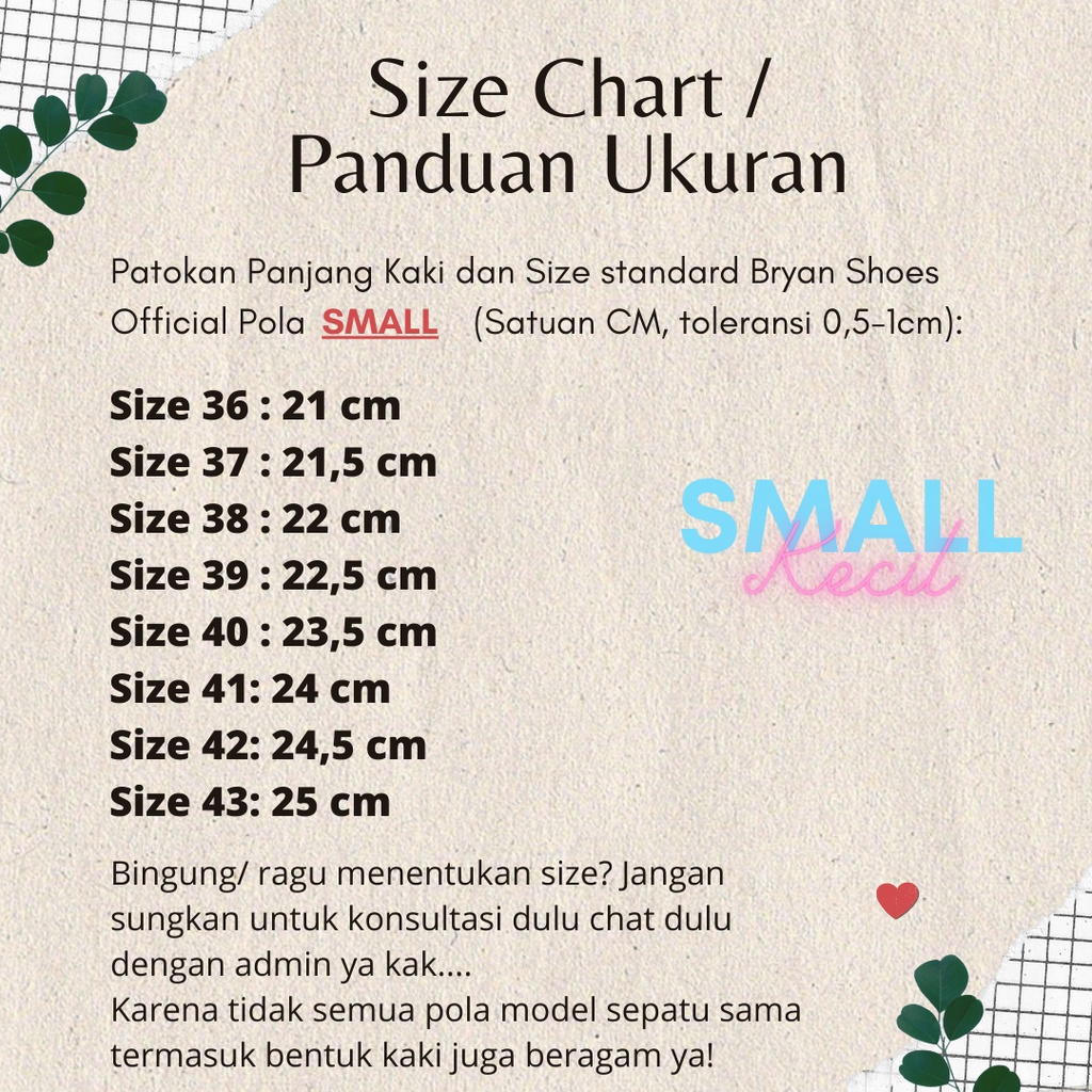 Panduan Size standard (POLA KECIL) Bryan Shoes Official: 36 : 21,5 cm 37 : 22 cm 38 : 22,5 cm 39 : 23 cm 40 : 23,5 cm 41: 24 cm 42: 24,5 cm 43: 25 cm