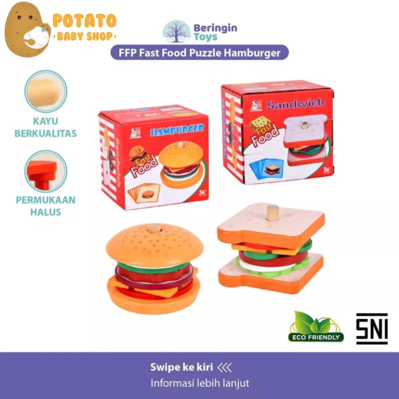 Fast Food Puzzle FFP merupakan mainan edukasi berbahan dasar kayu berkualitas dan memiliki permukaan yang halus sehingga aman dimainkan oleh anak-anak.