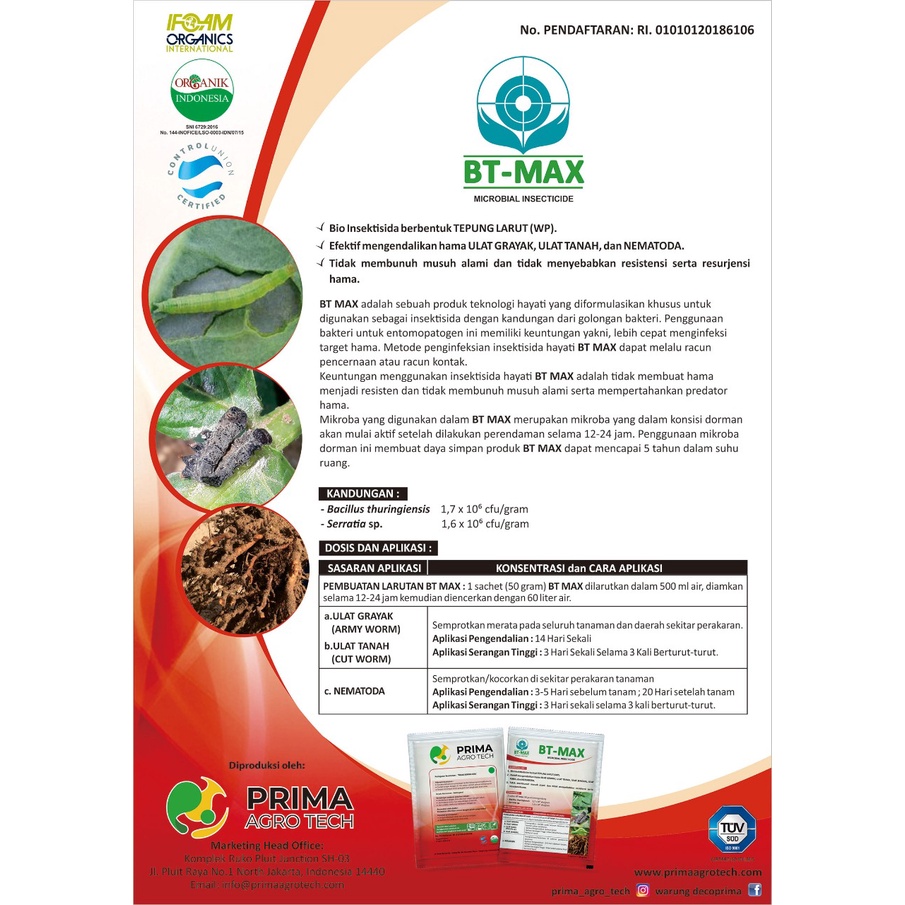 BT Max 50 Gram Bio Insektisida Ulat Thrips dan Kutu Daun Keunggulan - Bio insektisida berbentuk tepung larut (WP). - Bakteri kandungan bekerja secara sistematik/endofit yang mampu masuk ke dalam jaringan tanaman sebagai entomopatogen (agen hayati pengendali ulat). - Efektif mengendalikan ulat penggerek batang padi dan ulat grayak bawang merah. Komposisi - Bacillus thuringiensis strain 4042 1 x 107 cfu/gram - Serratia marcescens strain NPKC3_2_21 1 x 107 cfu/gram