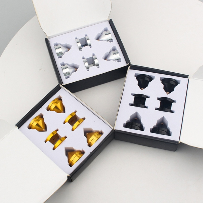 4 Set Speaker Berdiri Kaki Bantalan Kaki Paku Paku Kerucut Penyerapan Guncangan Kuat Fitur: baru dan berkualitas tinggi Terbuat dari paduan aluminium berkualitas tinggi dan bahan tembaga untuk efek yang lebih baik, berkualitas dan bantalan dasar yang tahan lama. Kompatibelitas Universal dengan sebagian besar speaker. 1 Kotak berisi kuku 4 kaki dan bantalan 4 kaki. Penyerapan goncangan yang kuat dan perangkat keras konfigurasi tinggi. Tinggi: 22.4mm/0.88in; Diameter Dasar: 23mm/0.91in