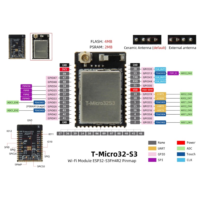 T-micro32-s3 Papan Pengembangan Flash ESP32-S3 yang kompatibel dengan Bluetooth 4MB Fitur: Papan Pengembangan PSRAM T-Micro32-S3 yang kompatibel dengan WiFi Bluetooth 4MB Flash 2MB PSRAM; Kompatibel dengan WiFi Bluetooth; kompatibel dengan WiFi; kompatibel dengan WiFi Psram: 2MB;; 2MB; Denyar: 4MB; 4MB; 4MB; Papan PCB Tahan Lama; Papan PCB; Papan PCB Tahan Lama;