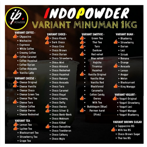 Saat ini produk minuman sedang digemari oleh banyak kalangan masyarakat, Indo powder menyediakan minuman bubuk dengan berbagai varian rasa. Cocok untuk Anda buat sendiri di rumah maupun untuk usaha waralaba.