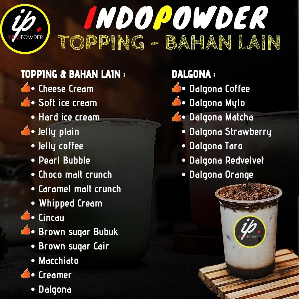 Saat ini produk minuman sedang digemari oleh banyak kalangan masyarakat, Indo powder menyediakan minuman bubuk dengan berbagai varian rasa. Cocok untuk Anda buat sendiri di rumah maupun untuk usaha waralaba.