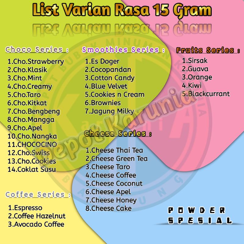 Bubuk Minuman Rasa 15gr ๐ List Rasa Geser Photo๐ ======================================== ๐*MINIMAL ORDER 10 PCS YA,Bisa MIX RASA*.๐ Harga tercantum per 1 pcs.ORDER KURANG dari 10 pcs Kami kirim 1 pcs/tdk dikirim/Dikirim Produk Mainan. ๐Bubuk minuman BUBBLE DRINK / BUBBLE TEA / MILK SHAKE.๐ bahan baku untuk membuat Minuman bubble drink/bubble tea,Milkshake,freshmilk,ice kepal milo ,ice blended dll.
