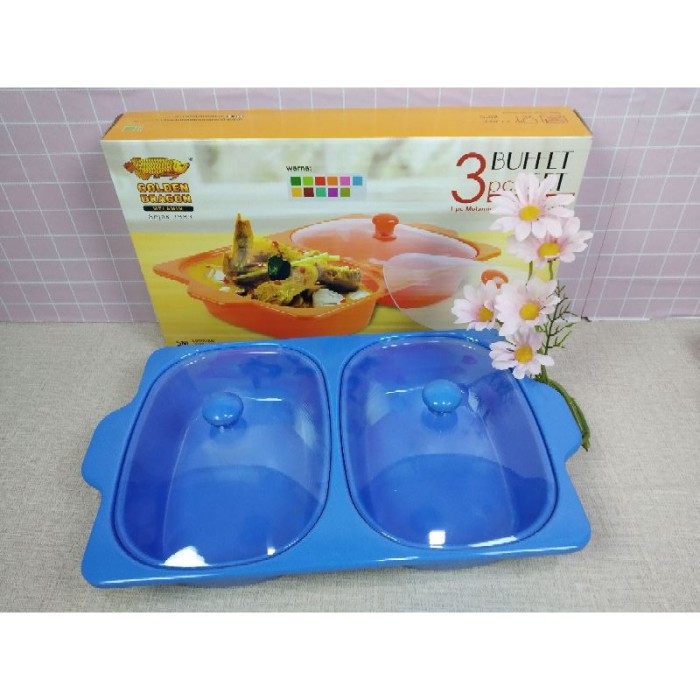 Buffet Set Double Golden Dragon Melamine cocok untuk digunakan saat menyajikan makanan di acara-acara spesial dirumah anda seperti arisan, kendurian, pesta ulang tahun, dan hari raya keagamaan. Cocok untuk dipadukan dengan piring dan mangkok yang berwarna hijau. Dilengkapi dengan tutup tembus pandang dari material plastik food grade yang akan memudahkan anda saat melihat isi makanan, makanan pun tetap bersih dan higienis. Mudah dibersihkan dan tahan noda makanan. Diproduksi dengan bahan baku melamine standard Food Grade. Bersertifikat SNI (Standar Nasional Indonesia). Aman untuk menyajikan makanan panas sampai 120 derajat celcius dan dingin sampai -15 derajat celcius. Tidak untuk dimasukkan ke dalam microwave dan tidak untuk memanaskan makanan dengan kompor.