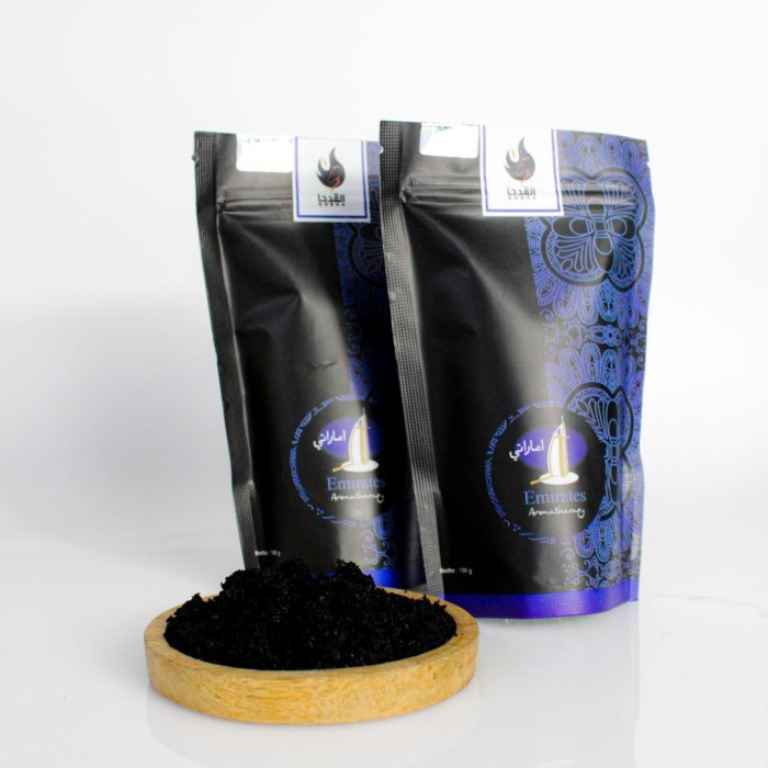 Nama Produk : Bukhur Qodha 100 gr Varian : Emirates Jenis : Serbuk Isi : 100 gr Berat : ±200gr/kemasan