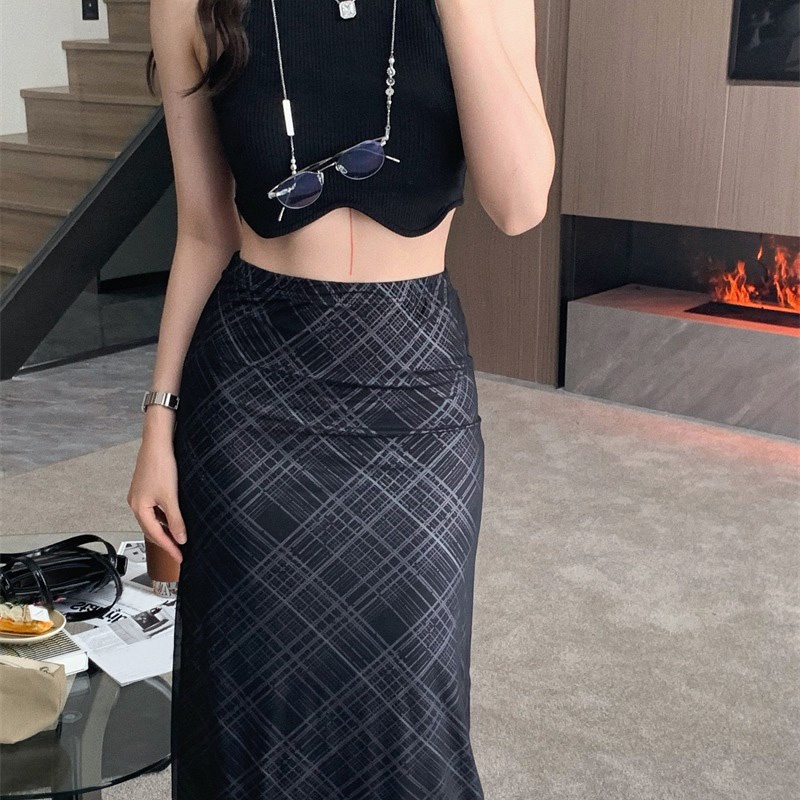 Buktikan Rok Elastis Pertengahan Panjang Musim Panas Pinggang Tinggi Retro Kotak-kotak Warna Kontras Rok Feminim Temperamen Slim A-line Tas Hip Rok Mesh Benang