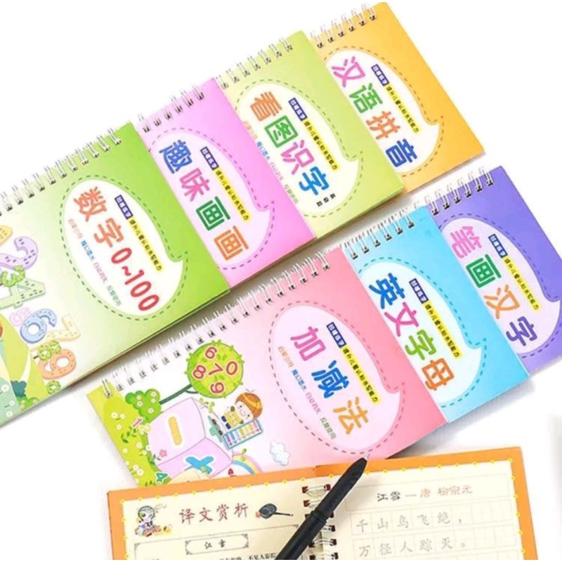 DESKRIPSI PRODUK : BUKU AJAIB SET 4PCS + PENA PULPEN / BUKU BELAJAR ANAK MENULIS ANGKA HURUF GAMBAR / MAGIC BOOK 1 SET ISI 4PCS BISA HAPUS / SANK MAGIC BOOK PRACTICE
