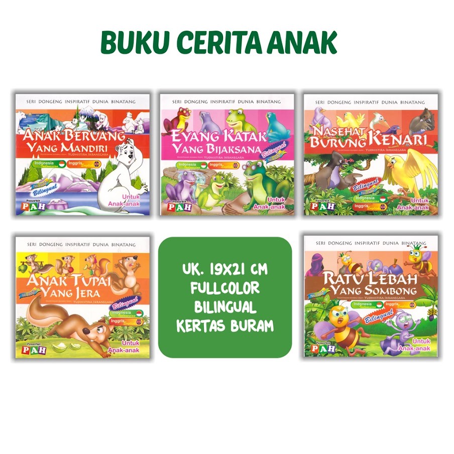 Buku dongeng untuk melatih anak supaya suka membaca / untuk dongeng sebelum tidur, ataupun untuk isi bingkisan goodie bag ultah anak. buku full color sehingga anak-anak akan suka & lebih bersemangat untuk membaca, terdapat 2 bahasa : Indonesia & Inggris (Bilingual)