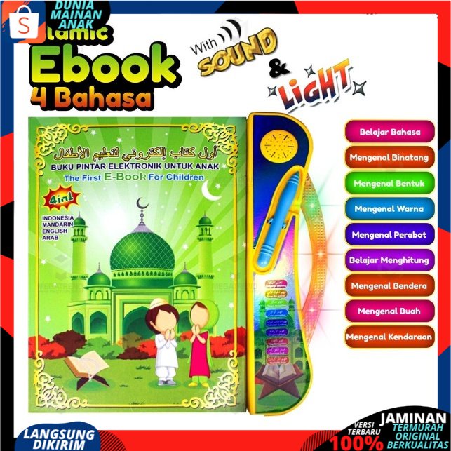 - Sudah Dilengkapi Dengan Lampu Pada Bagian Pegangan - Mainan The First E-Book Muslim For Children 4in1 ( Indonesia,Inggris, Arab, Mandarin ) - Mainan Berbentuk Buku Yang Dirancang Untuk Belajar Anak - E-Book Ini Mudah Digunakan Untuk Mempelajari Ilmu Sains - Sangat Bermanfaat Karena Desainnya Yang Menarik Terdiri Dari 10 Halaman Touch Pad - Buku Ini Berisi Imu Pengetahuan Penting Bagi Pendidikan Anak Usia Dini - Tidak Hanya Untuk Dimainkan Tetapi Juga Mengedukasi Anak - E-Book Ini Dilengkapi Dengan Materi Pengenalan Terhadap : Huruf, Angka, Hewan, Buah, Sayuran, Bentuk & Warna Serta Kendaraan - E-Book Ini Dilengkapi Dengan Materi Pengenalan Terhadap : Pancasila, Lambang-lambang Kota Indonesia, Tata Cara Sholat, Tata Cara Wudhu, Doa-Doa Keseharian, Huruf Hijaiyah, - Selain Itu, Mainan Ini Juga Memiliki Fungsi Bisa Mengeja Dengan 4 Bahasa (Bahasa Indonesia, Inggris, Arab, Mandarin)