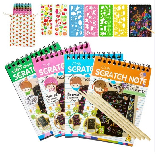 Scratch Paper Notes : Notes dengan halaman kosong berwarna hitam polos. Jika digambar dengan pensil kayu khusus (termasuk dalam paket) maka akan menghasilkan goresan berwarna warni yang menakjubkan.