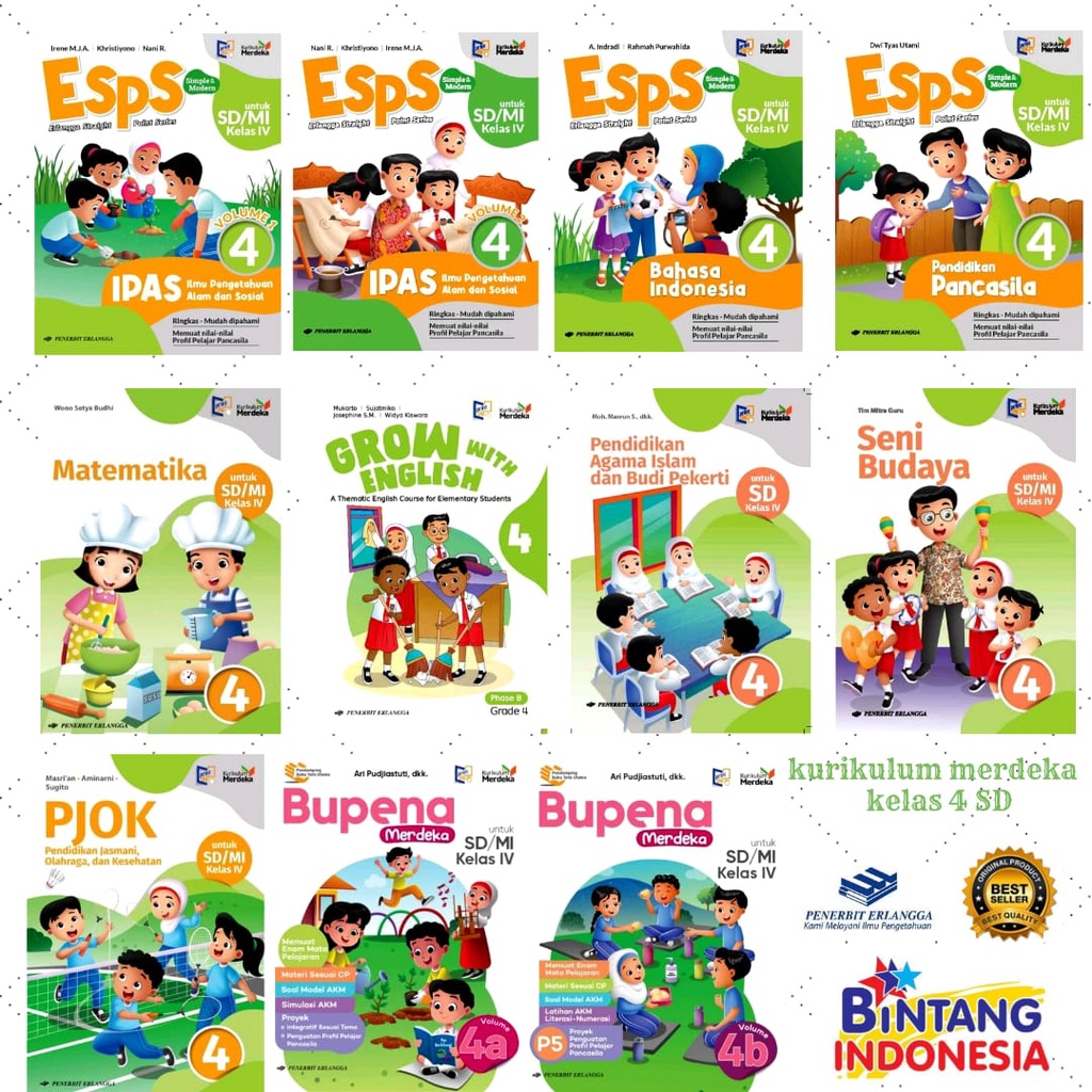 Buku Pelajaran KELAS 4 SD/MI Kurikulum Merdeka Buku Pelajaran / isbn : - MATEMATIKA 4 : 002-510-146-0 - ESPS IPAS 4 vol 1 : 002-500-099-0 - ESPS IPAS 4 vol 2 : 002-500-100-0 - ESPS B INDONESIA 4 : 002-410-058-0 - ESPS P PANCASILA 4 : 002-323-016-0 - PJOK 4 : 002-613-031-0 - SENI BUDAYA 4 : 002-700-010-0 - GROW WITH 4 : 002-420-035-0 - P.AGAMA ISLAM 4 : 002-297-044-0 - BUPENA 4A : 002-371-390-0 - BUPENA 4B : 002-371-391-0 Penerbit : ERLANGGA- ======================================== - Distributor Buku Pelajaran SD/MI - Yang kami jual adalah buku BARU dan ORIGINAL. - Silahkan Chat kami jika buku yang Anda cari tidak ada. - silahkan ikuti toko kami Bintang Indonesia