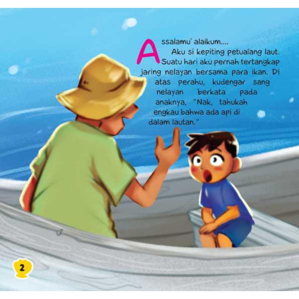Suatu hari Kepiting mendengar nelayan bercerita tentang api di laut. Ia penasaran apakah benar ada api di dalam laut.
