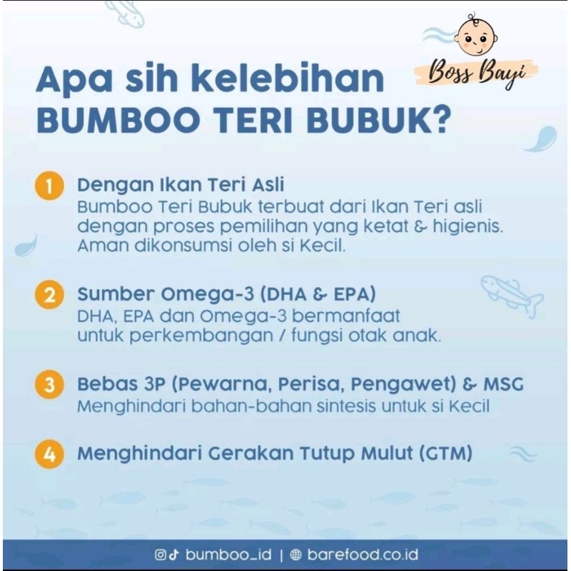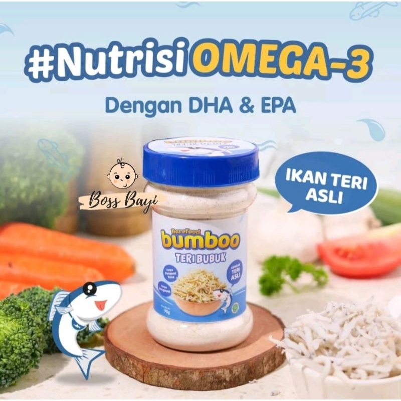 Produk baru dari Barefood! BUMBOO Teri Bubuk! Dibuat dari Ikan Teri Asli dan menjadi sumber Omega-3 (DHA & EPA) untuk Si Kecil. Bumboo Teri Bubuk dibuat tanpa MSG dan tanpa 3P sehingga aman untuk dikonsumsi Si Kecil