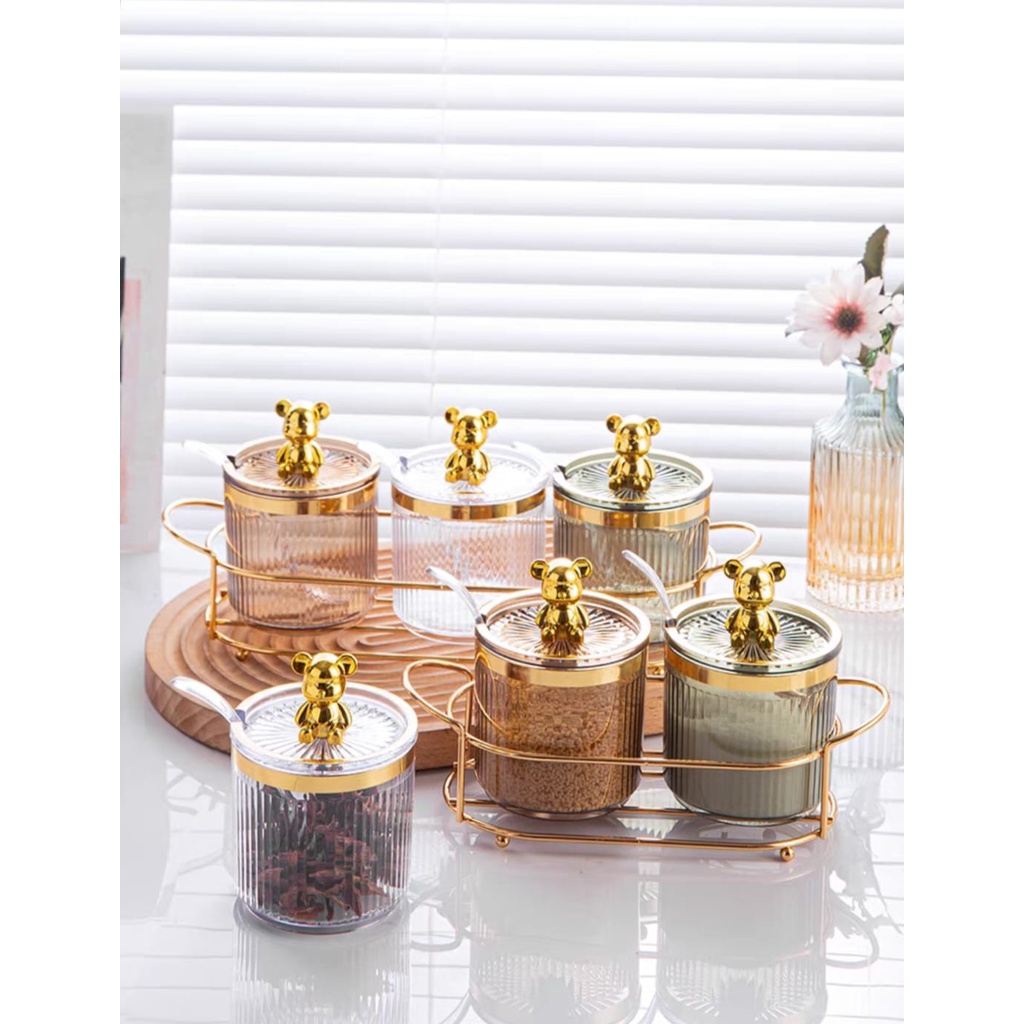 Tempat Bumbu Bear Gold 3 In / STR / Tempat Bumbu / Bear Seasoning Jar Tempat Bumbu 3 Piece With Tray Transparant / Keranjang Tempat Penyimpanan Bumbu / Tempat Bumbu