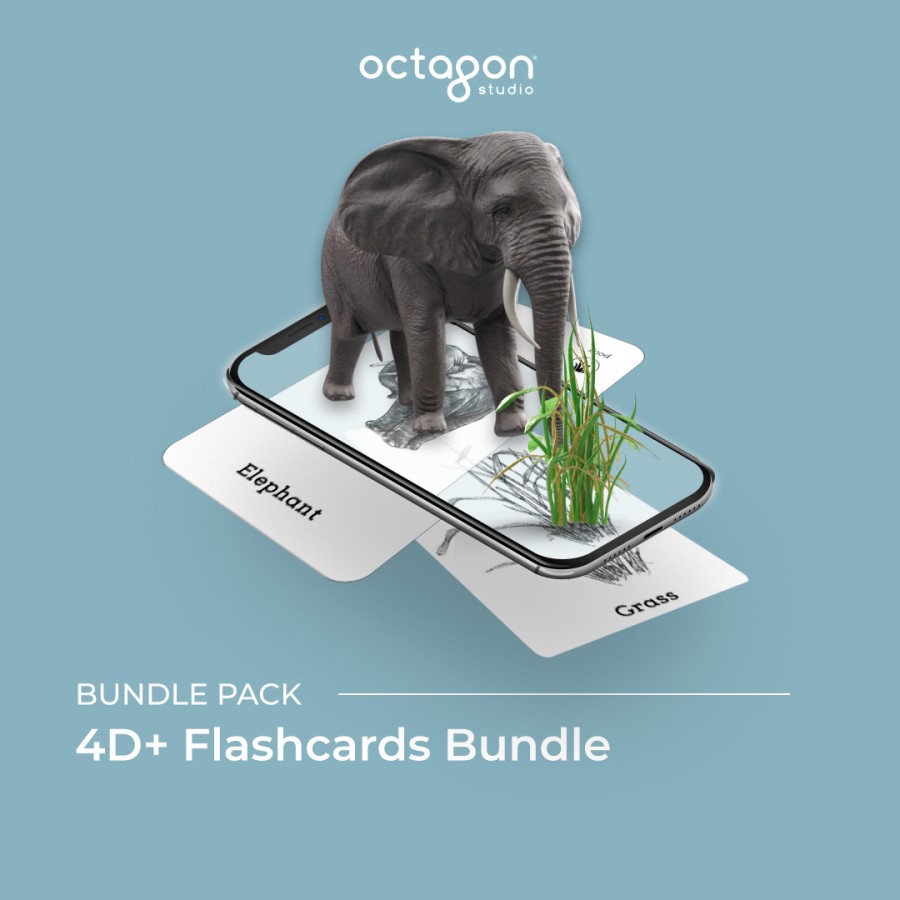 Dapatkan rangkaian lengkap 4D+ Flashcards Octagon Studio dengan membeli bundle flashcard ini! Bundle flashcard terdiri dari Animal 4D+ (lengkap dengan set Foodcards), Octaland 4D +, Dinosaur 4D + dan Space 4D +. Terdapat Nomor Seri dibalik Kartu Instruksi yang valid untuk 3 perangkat yang bisa Anda gunakan untuk menghidupkan keajaiban dunia Realitas Tertambah (Augmented Reality/AR) di masing-masing Aplikasinya!"