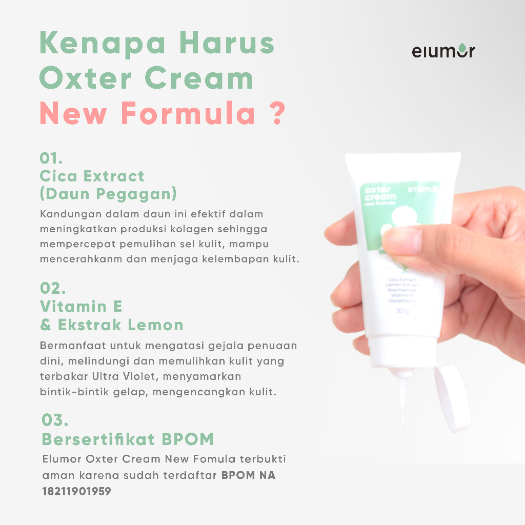 Kelebihan Elumor Oxter Creame 30g & Oxter Gel 50g : 1. Aman sudah BPOM 2. Aman untuk ibu hamil & menyusui 3. No Fragrance, No Paraben, No Alcohol jadi Aman untuk kulit sensitif 4. Terbuat dari bahan alami yaitu daun gumar (Gymnema Sylvestre Extract) 5. Tekstur yang tidak lengket dan mudah meresap 6. Minim efek samping