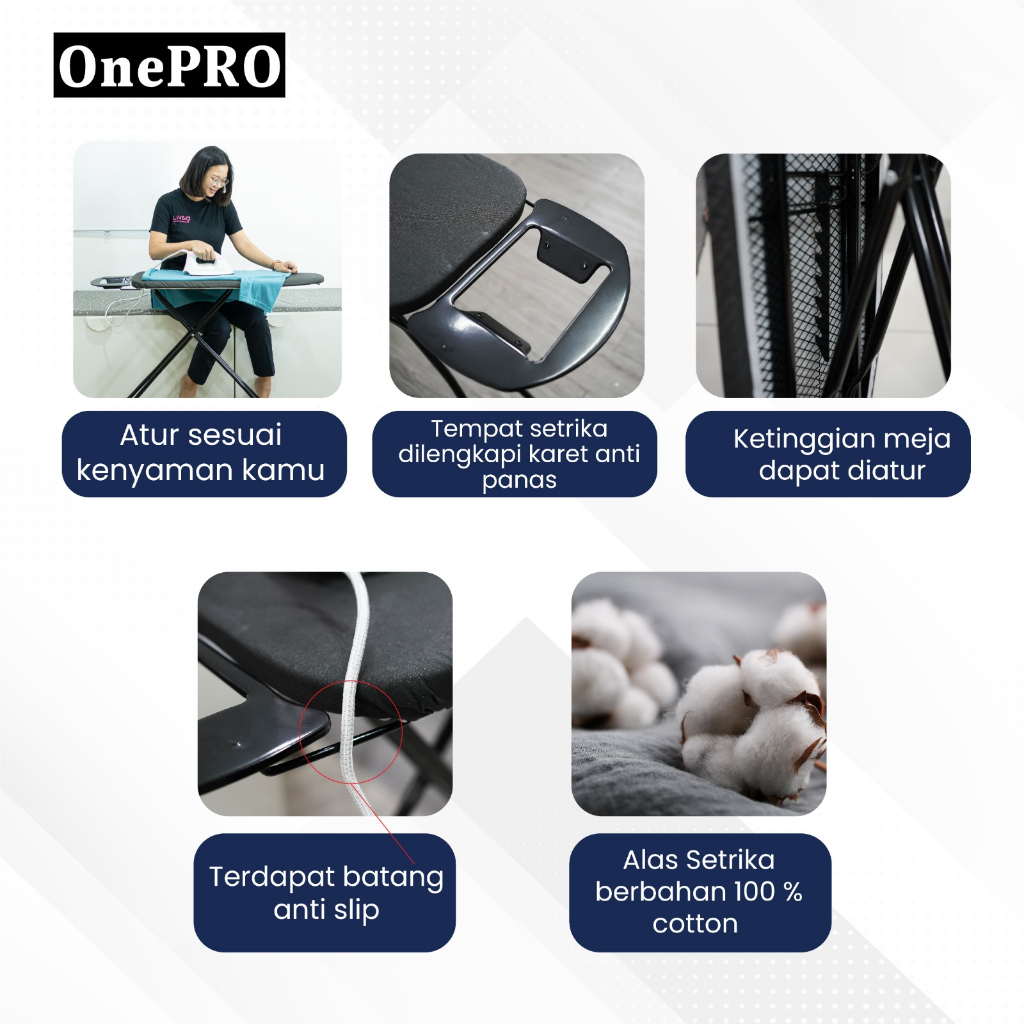 *Meja setrika ini memiliki model yang simple mudah dilipat dan disimpan, dengan cover kain katun 100% yang dapat dilepas/dicuci, meja setrika dilapisi busa tebal, kaki meja setrika dapat diatur ketinggiannya sesuai keinginan , dan terdapat iron rest sehingga memudahkan pekerjaan menyetrika anda - Garansi 2 minggu (Kerusakan dr Pabrik) - Terdapat Iron Rest yg tahan panas - Mudah dilipat dan disimpan - Kaki meja tedapat karet/antislip - Packaging wraping tidak menggunakan dus