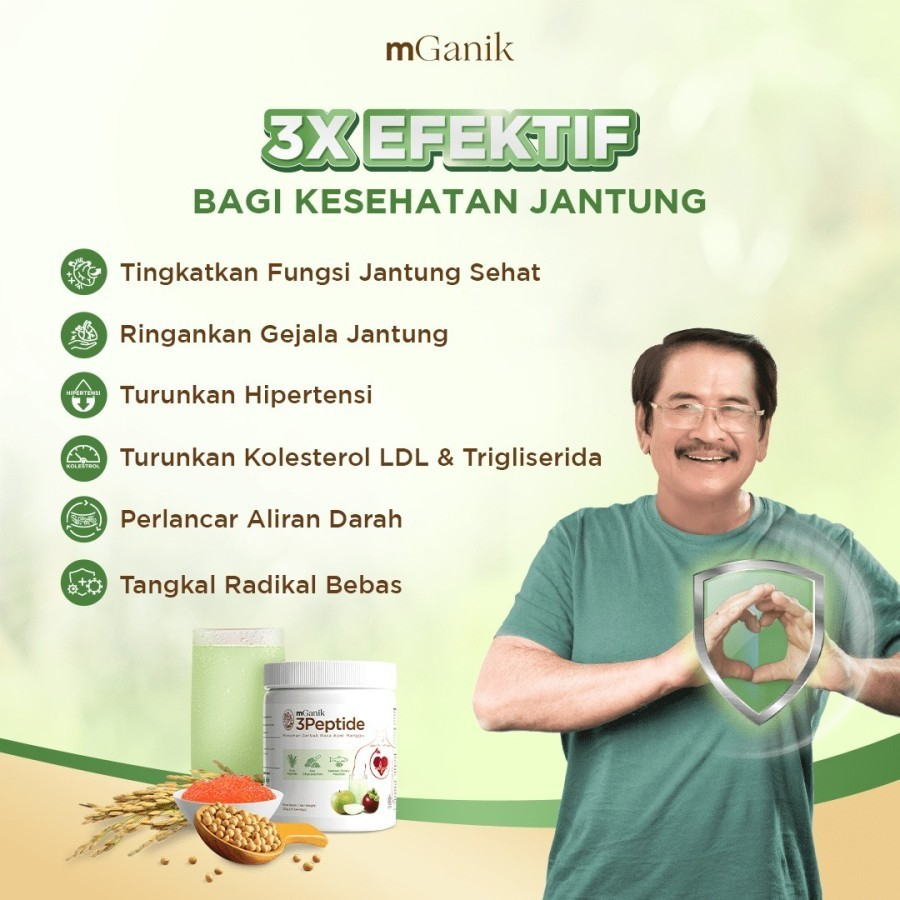 Manfaat mGanik 3Peptide: - Efektif menurunkan kadar Hipertensi (darah tinggi) - Memperlancar aliran darah - Membantu menurunkan kadar Kolesterol LDL / Trigliserida tinggi - Menangkal radikal bebas - Membantu menyehatkan dan meningkatkan fungsi jantung - Mengurangi keluhan gejala penyakit jantung